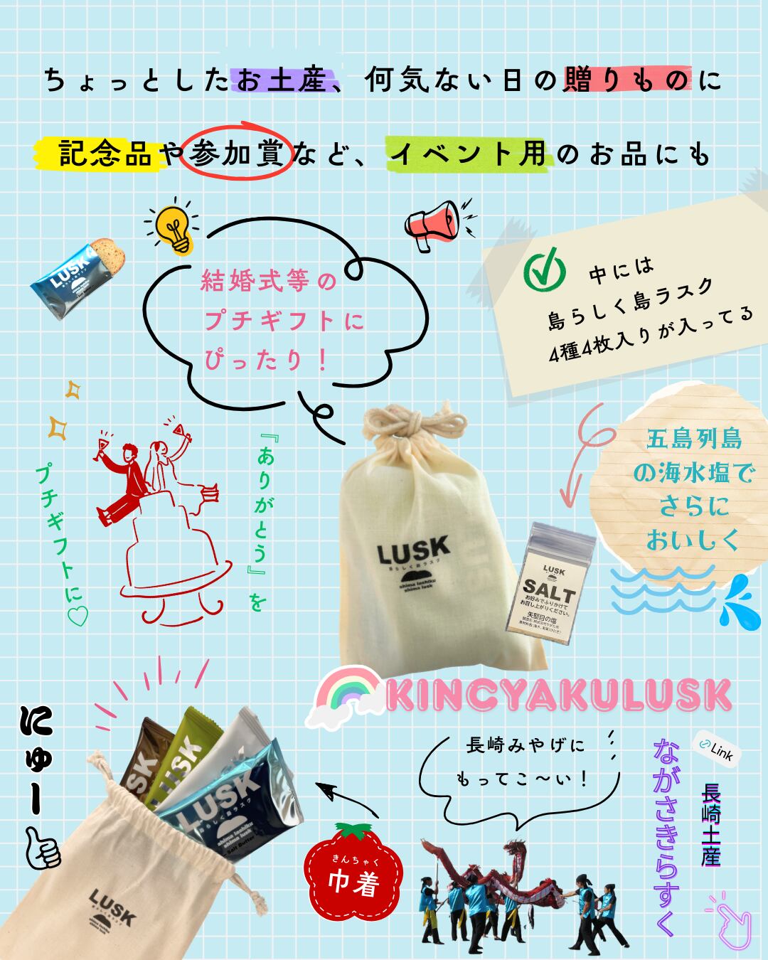 弊社創立20周年記念時にプレゼント企画としておつくりしたオリジナル巾着袋が、特別なギフトにぴったりな「巾着島ラスク」になって登場です。